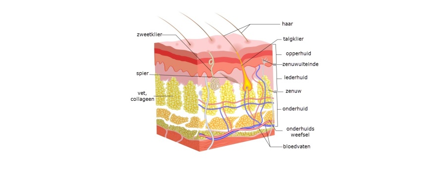 De huid bestaat uit drie lagen, van buiten naar binnen zijn dat: